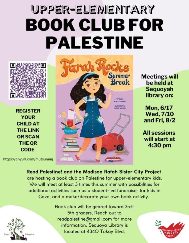 Categories Uncategorized Madison: Book Club for Palestine! June, July and August 2024 Post author By wibailoutpeople Post date June 12, 2024 Madison-Rafah Sister City Project Share this: Click to share on X (Opens in new window) X Click to share on Facebook (Opens in new window) Facebook Like Loading... Related ← Madison at the State Capitol June 13, 2024: Fasting for an end to the U.S.-Israel war and the genocide in Gaza → Madison, June 22, 2024: Building Unity Gathering