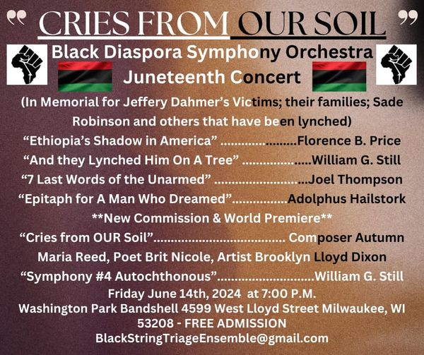 Categories Uncategorized Milwaukee, June 14, 2024: “Cries From Our Soil” – Black Diaspora Symphony Orchestra Juneteenth Concert Post author By wibailoutpeople Post date June 14, 2024 Share this: Share on X (Opens in new window) X Share on Facebook (Opens in new window) Facebook Like Loading... Related ← Madison Farmer’s Market: Stop the Genocide of Palestinians! → Milwaukee Teachers’ Education Association (MTEA) Passes RESOLUTION ON CEASEFIRE IN GAZA AND OCCUPIED PALESTINE
