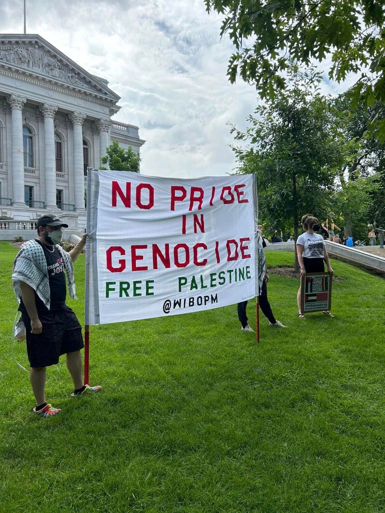 Categories Uncategorized Trans Rights Fighters at the State Capitol in Madison Declare: NO PRIDE IN GENOCIDE – FREE PALESTINE! – Stonewall Means Fight Back! Post author By wibailoutpeople Post date June 30, 2024 At the State Capitol in Madison, Wisconsin June 29, 2024. Photo: Wisconsin Bail Out The People Movement Action sponsored by: Trans Resistance Action Committee Share this: Click to share on X (Opens in new window) X Click to share on Facebook (Opens in new window) Facebook Like Loading... Related ← Dr. Kwame Ture – Lessons from the 60s → Pentagon germ warfare campaign to smear China kills thousands in the Philippines