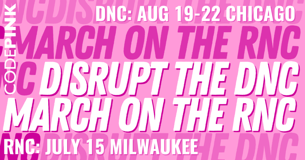 The RNC & DNC are coming up and, in true CODEPINK fashion, we’re going to be there to disrupt these events that put war criminals on a pedestal! In the face of a genocide supported by the US, it’s more important than ever to raise our voices together and demand an end to US arms sales to Israel and to stop the US war machine!
