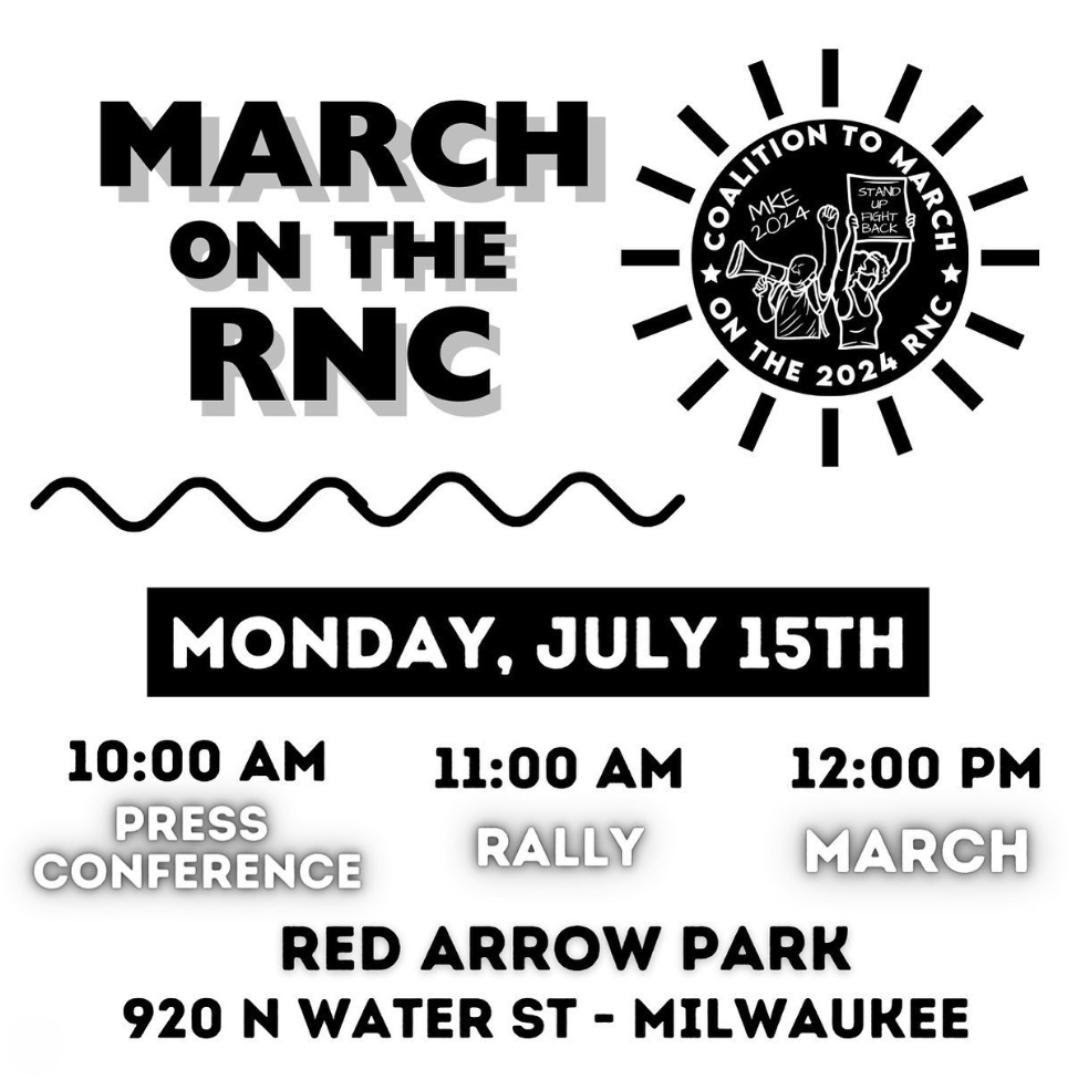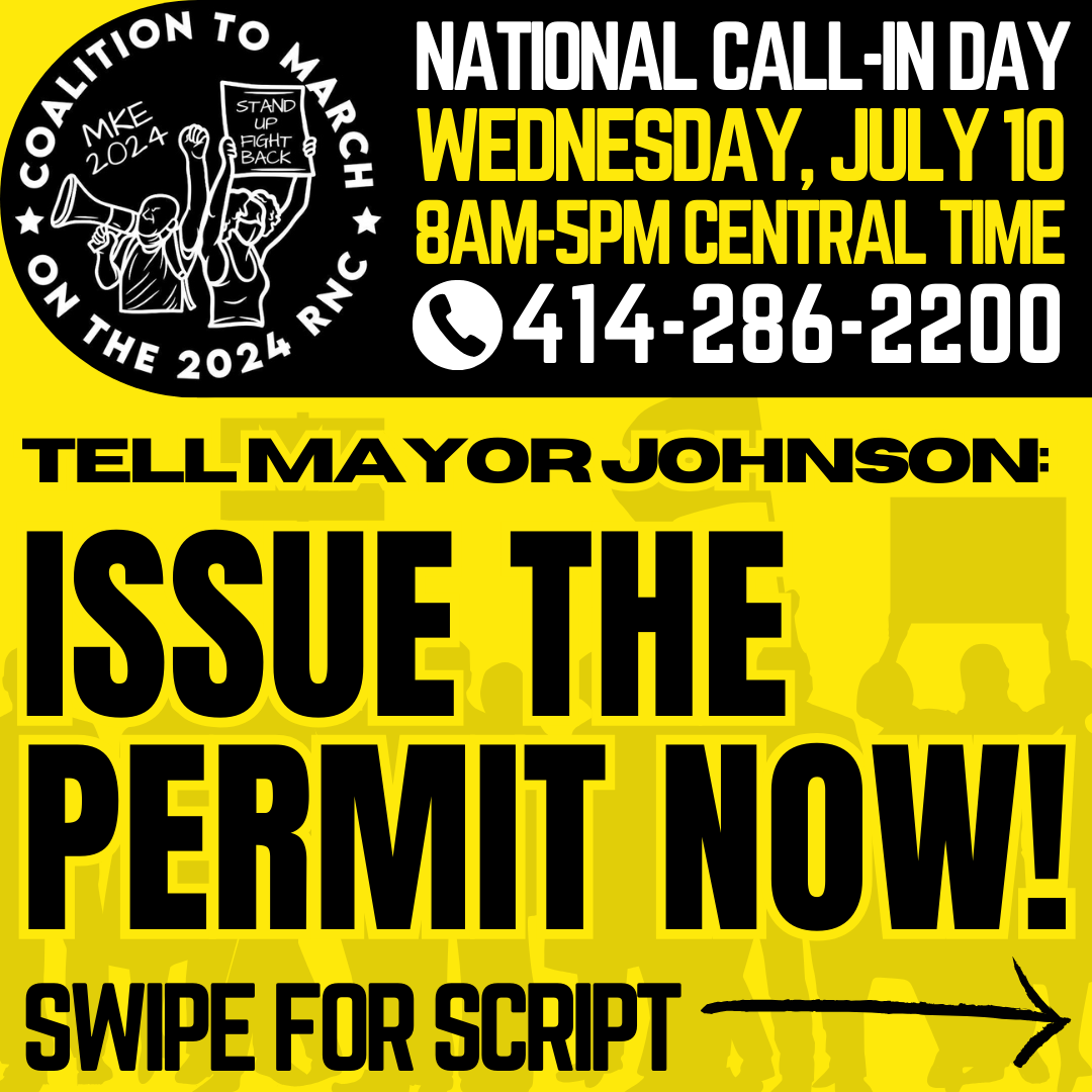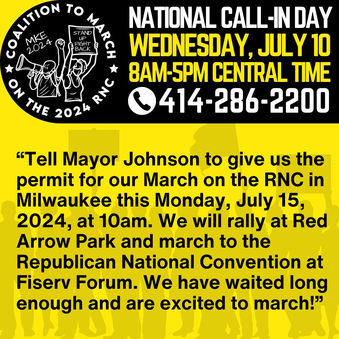 Categories Uncategorized Coalition to March on the RNC: National Call In Day July 10, 2024 to Demand Milwaukee Mayor Issue a Permit! Post author By wibailoutpeople Post date July 9, 2024 for a national call-in day Share this: Click to share on X (Opens in new window) X Click to share on Facebook (Opens in new window) Facebook Like Loading... Related ← A Pan-Abolitionist View on Julian Assange’s Release → Celebrate the Voting Rights Victory! – Unlock the Drop Boxes! July 11, 2024 in Madison, Wisconsin