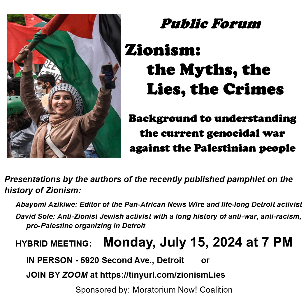Categories Uncategorized Online & In-Person (Detroit): July 15, 2024 Public Forum ‘Zionism: The Myths, the Lies, the Crimes! Post author By wibailoutpeople Post date July 13, 2024 Moratorium NOW! Coalition Share this: Click to share on X (Opens in new window) X Click to share on Facebook (Opens in new window) Facebook Like Loading... Related ← Venezuela & ALBA News 7.12.2024 – Venezuela High Stakes Presidential Election; Bolivia Arrests 24 Coup Plotters; Daniel Ortega at 82% approval → Cuba & Palestine!