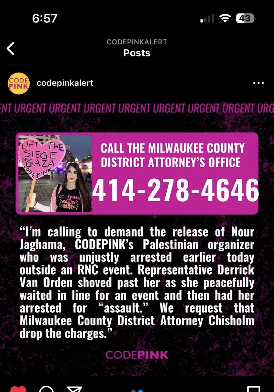 Code Pink in a statement after the arrest identified the woman involved in the incident as the group’s Palestinian campaign organizer, Nour Jaghama.