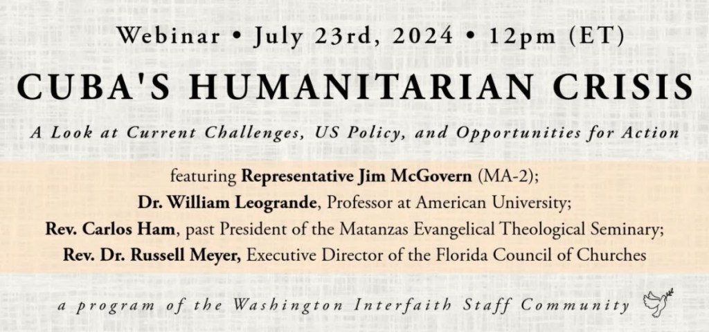 | Cuba is at a difficult crossroads and facing an unprecedented political, social, and economic crisis, effecting the daily lives and survival of everyday people on the island. There are historic shortages, and the majority of Cuban people live with uncertain access to basic necessities and food. Hundreds of thousands of Cubans have been forced to sell their belongings and undertake dangerous journeys to reach the United States via the Southwest border. Despite the crisis, U.S. policy toward Cuba continues to be stuck in an outdated approach focused on maintaining an embargo and economically strangling the Cuban people. Our Cuban church partners are urgently asking for US Christians to advocate for an easing of US economic restrictions and a change in US policy to relieve the suffering of the Cuban people, help them to prosper in their own country, and include them fully in the family of nations. Please join the Faith Cuba Working Group for a webinar to hear from Cuban partners and experts on US Cuba relations, gain a deeper understanding of the ongoing crisis, explore evolving challenges and opportunities for action, and learn about the recent impacts of U.S. policy. Featuring: Congressman Jim McGovern, Representative for Massachusetts’s 2nd District, and co-chair of the Tom Lantos Human Rights Commission Dr. William LeoGrande, professor of Government at American University (AU) in Washington, DC, and former Dean of AU’s School of Public Affairs Rev. Carlos Ham, former President of the Caribbean Conference of Churches and past president of the Matanzas Evangelical Theological Seminary in Cuba Rev. Russell Meyer, Executive Director of the Florida Council of Churches This webinar is live on July 23rd, at 12pm EST. |