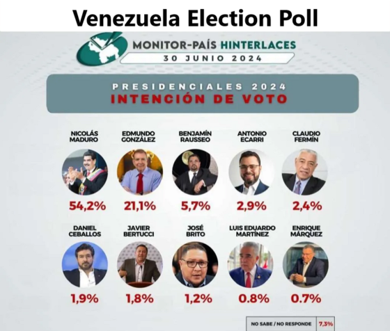 Orinoco Tribune: Venezuela: President Maduro Leads in the Polls Before Presidential Elections According to Hinterlaces, which carried out a national survey by sampling with respect to gender, age, locality, and socio-economic and educational levels, President Maduro leads voting intentions with 54.2%, far ahead of his closest contender, the candidate of the right-wing Unitary Platform (PUD), Edmundo González (21.1%). In response to the question “With which political party do you sympathize the most,” 52.1% chose PSUV-GPP, 14.4% selected the Unitary Platform, and 15.2% expressed support for other opposition parties. While 6.4% chose the option “Others”, 12.9% opted for Do not know/No response.