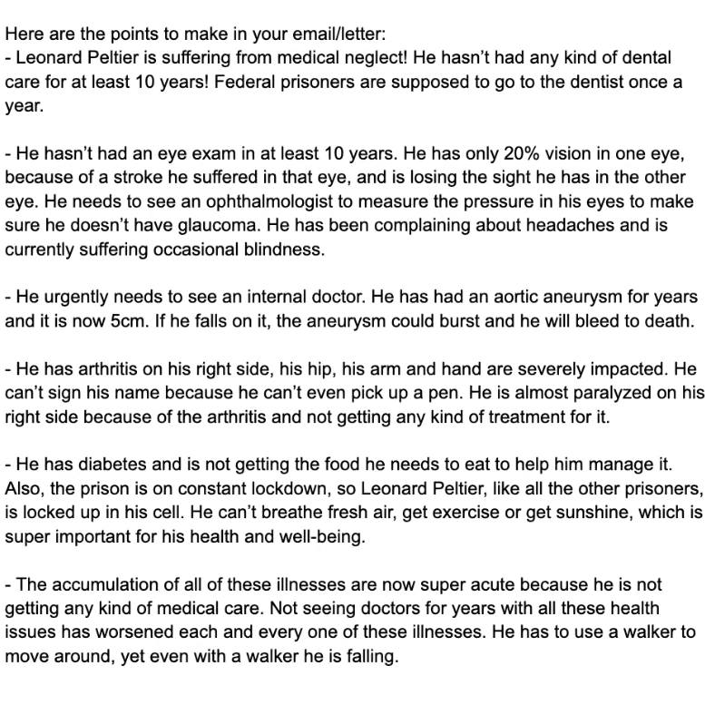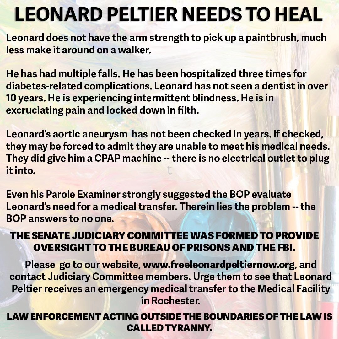 Leonard Peltier turns 80 in September and has been in prison for 48+ years. After multiple falls, hospitalizations, and years of medical neglect, he is in need of an emergency medical transfer! Consider writing email messages or letters or both to each and every Senator on the Senate Judiciary Committee (see slide 2) to make these demands. Look to slide 3 to see what points to make in your email and/or letter.