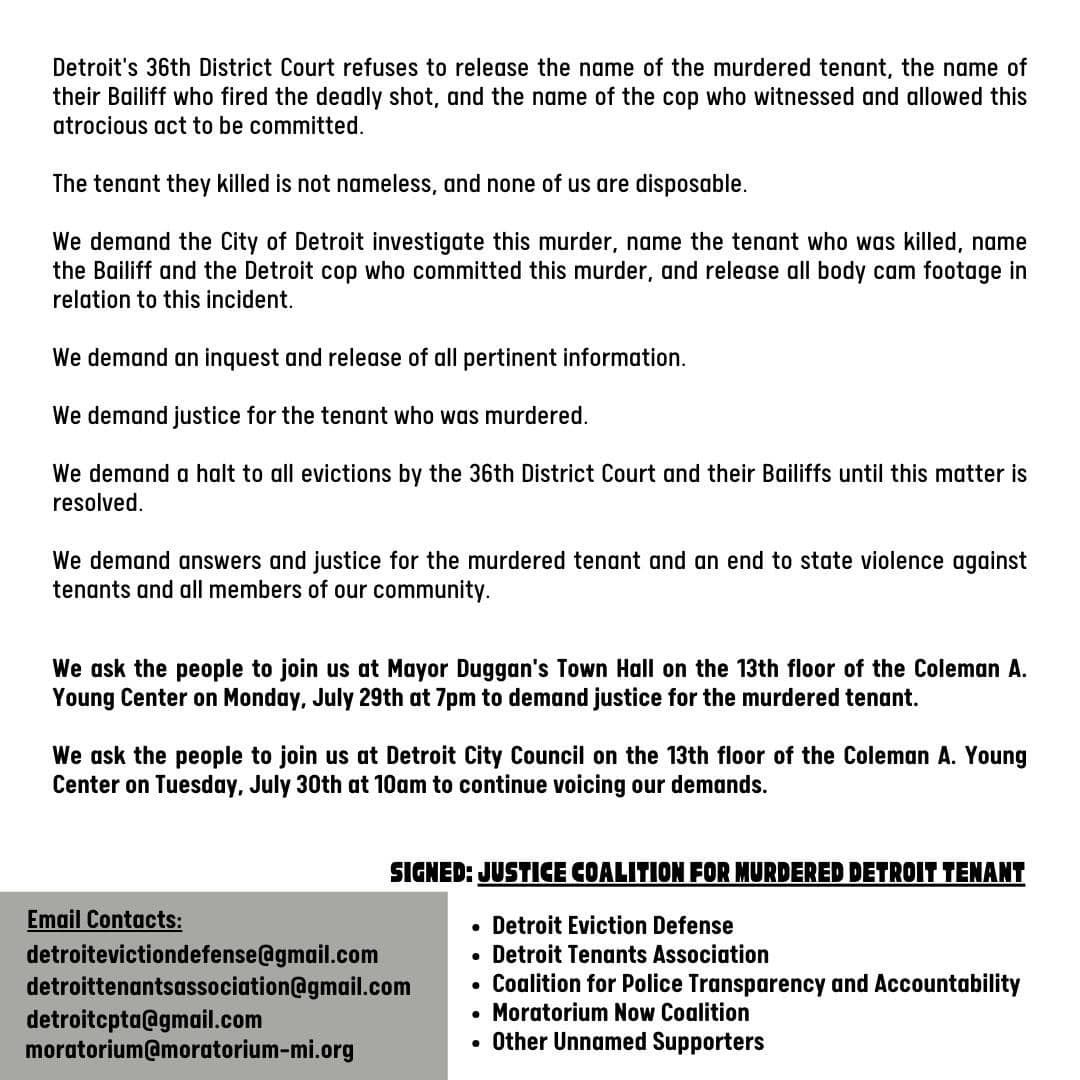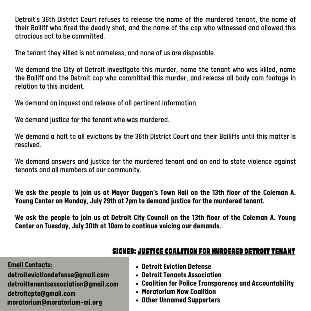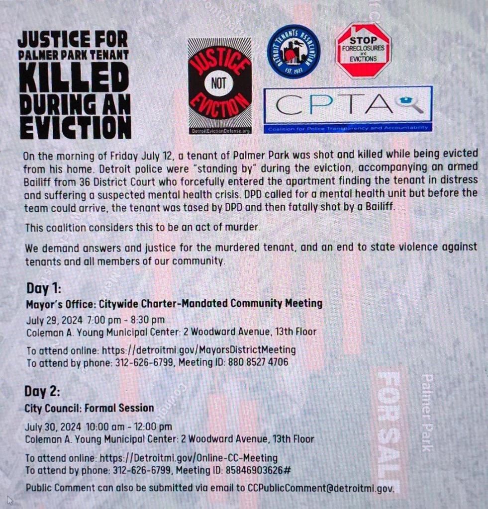 Categories Uncategorized Detroit: Justice for Palmer Park Tenant Killed During An Eviction! July 29 and 30, 2024 Protest Actions Post author By wibailoutpeople Post date July 28, 2024 Detroit Eviction Defense Moratorium NOW! Coalition Detroit Coalition for Police Transparency and Accountability Detroit Tenants Association Share this: Click to share on X (Opens in new window) X Click to share on Facebook (Opens in new window) Facebook Like Loading... Related ← Stop Union Busting! UAW UC Workers Protest UC Bosses & Felony Arrests For Chalking At UCSD → Milwaukee, July 29, 2024: Press Conference With Attorney Benjamin Crump & Protest for D’Vontaye L. Mitchell