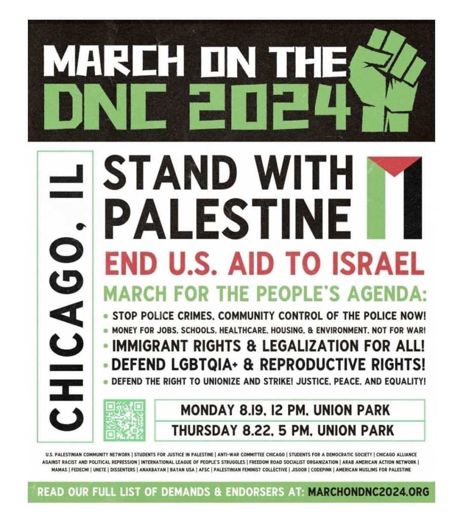 Categories Uncategorized Chicago: March on the DNC August 19-22, 2024 Post author By wibailoutpeople Post date July 30, 2024 Share this: Share on X (Opens in new window) X Share on Facebook (Opens in new window) Facebook Like Loading... Related ← Congratulations to Venezuela and re-elected President Nicolás Maduro Moros! → Sinead O’Connor – Free Palestine!