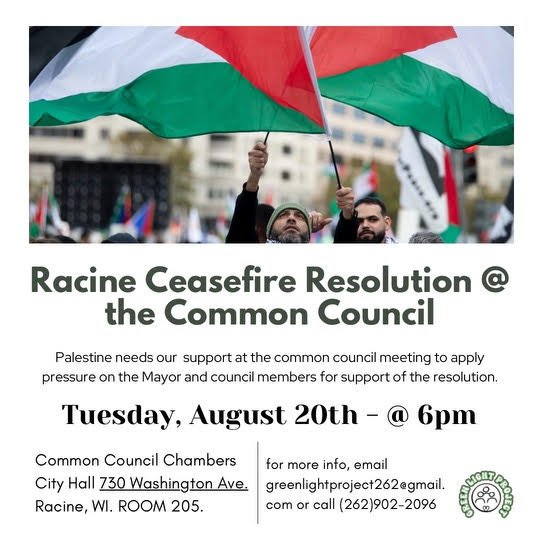 Categories Uncategorized Racine, August 20, 2024: Racine Ceasefire Resolution @ the Common Council Post author By wibailoutpeople Post date August 4, 2024 Share this: Click to share on X (Opens in new window) X Click to share on Facebook (Opens in new window) Facebook Like Loading... Related ← Madison, August 10, 2024: Fundraiser for Palestine Relief! → Fighting Words! News and Analysis from the Front Lines of the People’s Struggle!