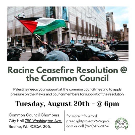 Sat Aug 10, 12:30 – 1:30 pm — Weekly Stand for Peace. At NW corner of Highways 31 and 20. Park in the SW corner of the Kohl’s parking lot, near the AT&T store. Supported by the Racine Coalition for Peace and Justice. We have signs, banners and flags available for all. Check out our website, for weather concerns. Free Palestine!