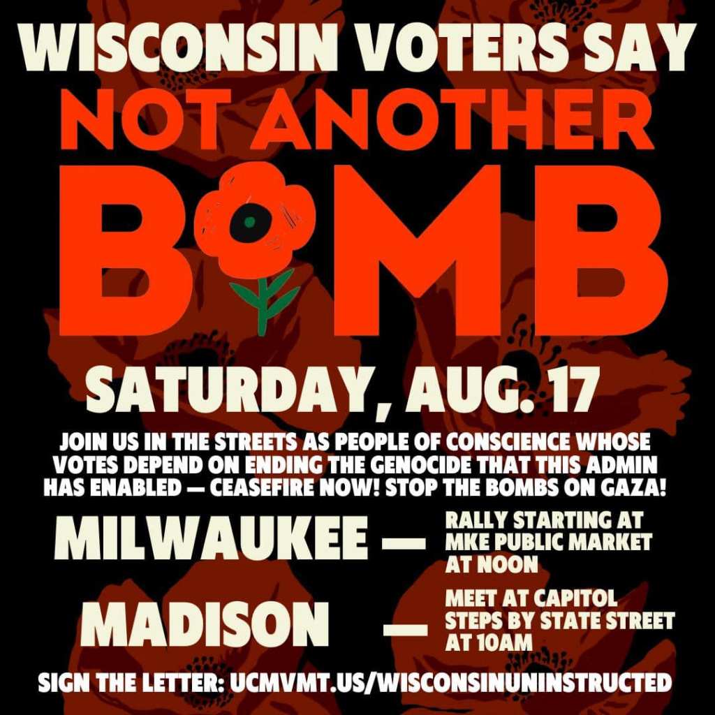 Categories Uncategorized Madison and Milwaukee August 17, 2024: Not Another Bomb! – Free Palestine! – Money for People’s Needs Not Endless U.S. Wars! Post author By wibailoutpeople Post date August 12, 2024 Share this: Share on X (Opens in new window) X Share on Facebook (Opens in new window) Facebook Like Loading... Related ← Wisconsin: Don’t get hoodwinked, Vote NO to the proposed amendments August 13, 2024 → Milwaukee, August 17, 2024: Not Another Bomb! – Free Palestine! Rally