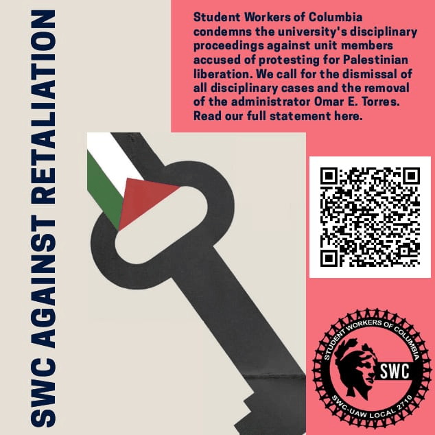 Categories Uncategorized To Columbia admin: NO RETALIATION against our members for protected activity! (Student Workers of Columbia-UAW Local 2710) Post author By wibailoutpeople Post date August 15, 2024 To Columbia admin: NO RETALIATION against our members for protected activity! (Student Workers of Columbia-UAW Local 2710) Share this: Share on X (Opens in new window) X Share on Facebook (Opens in new window) Facebook Like Loading... Related ← Support Labor for Palestine Organizers Protesting the DNC in Chicago August 18-22, 2024: No Support for Genocidal Candidates — Stop Arming Israel! → Commemorate the Haitian Revolution in the Spirit of Black August