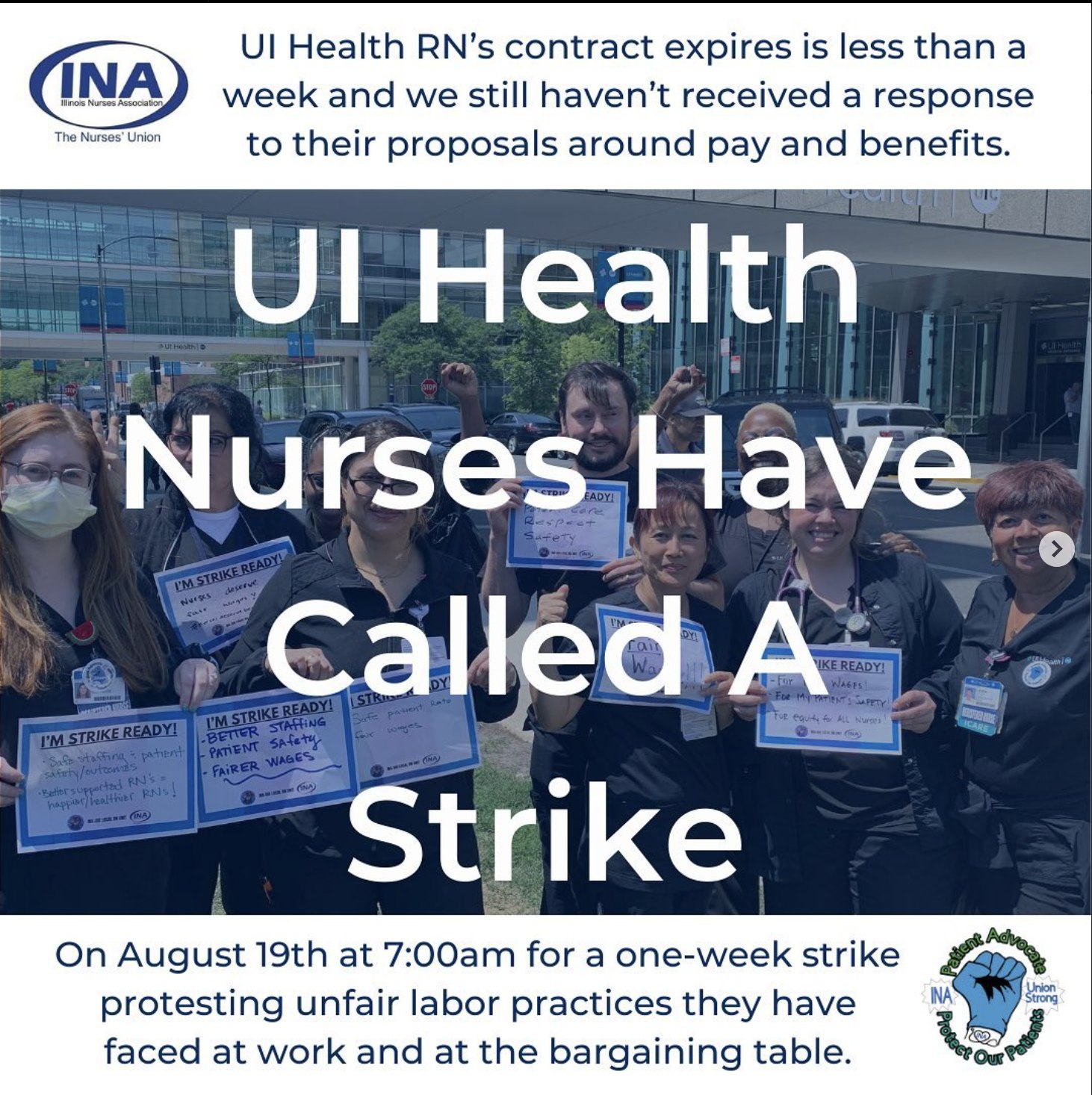 INA Nurses at UI Health have called for a strike! On August 19th, the 1,750 INA RNs and LPNs at University of Illinois Hospital – UI Health and at outpatient clinics throughout Chicago will walk out on a 7-day ULP strike. They voted 98% in favor (1349-29) to strike.