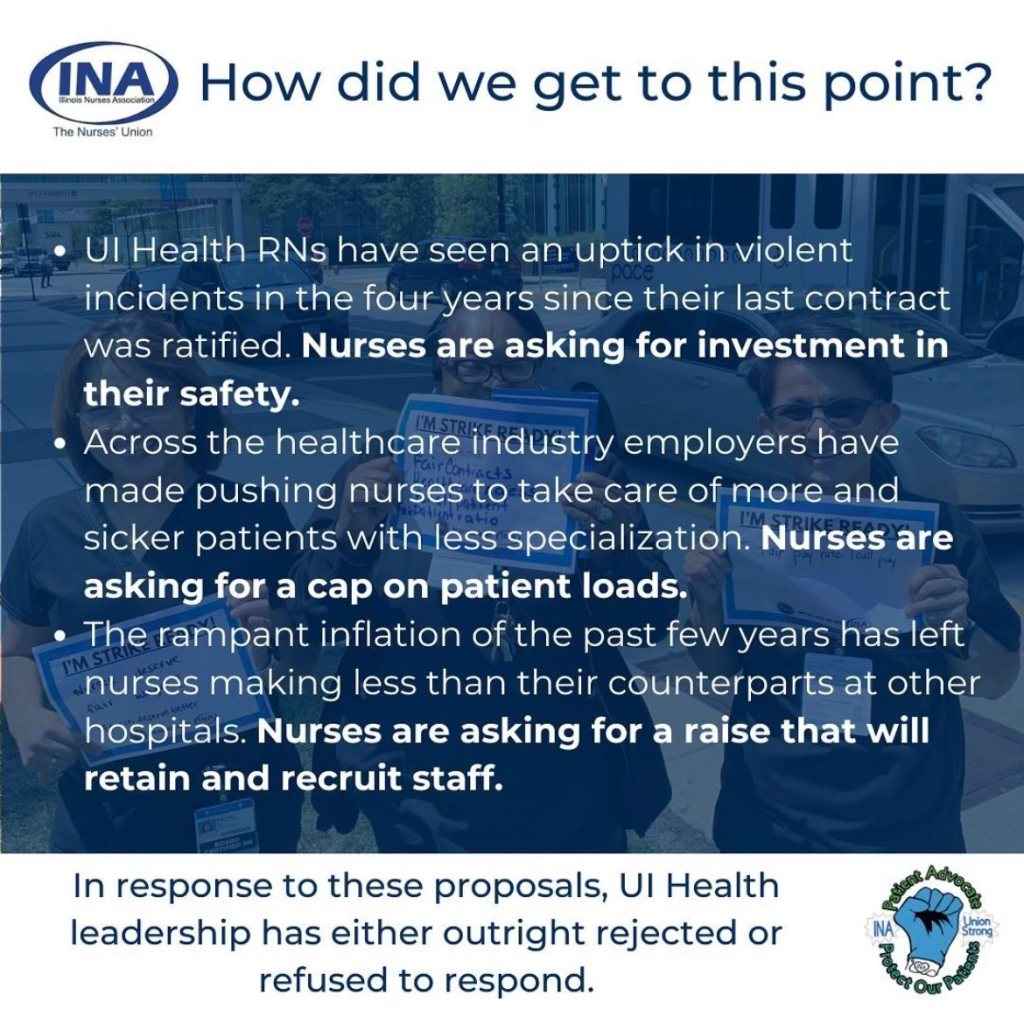 UI Health is one of Chicago’s most essential safety net hospitals. Its nurses have sacrificed their health and their family time to save lives, prevent COVID spread and treat Chicago’s most vulnerable patient community over the past few years. Over that same time they have experienced under staffing, workplace violence and a loss in purchasing power thanks to the record inflation of the past few years.