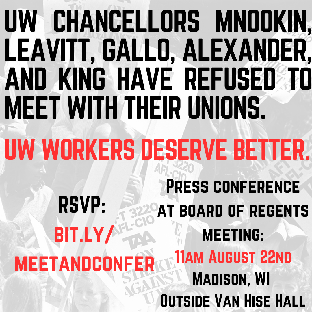 Join us at the Board of Regents meeting in Madison August 22nd at 11am for a press conference demanding all Chancellors across the UW System agree to meet & confer with their faculty, staff, and graduate student unions.