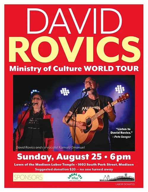 Categories Uncategorized David Rovics & Kamala Emanuel in Madison August 25, 2024 Post author By wibailoutpeople Post date August 22, 2024 https://www.davidrovics.com/ Share this: Share on X (Opens in new window) X Share on Facebook (Opens in new window) Facebook Like Loading... Related ← Free Simón Trinidad! August 29, 2024 Webinar with Legal Team and Campaign Launch → Madison, Labor Fest September 2, 2024