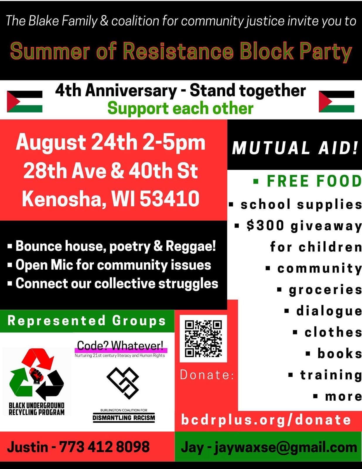 Categories Uncategorized Kenosha, August 24, 2024: The Blake Family – Summer of Resistance Block Party Post author By wibailoutpeople Post date August 22, 2024 Share this: Share on X (Opens in new window) X Share on Facebook (Opens in new window) Facebook Like Loading... Related ← UNION ACTION at UW-Madison August 22, 2024 to Demand Administrators Meet & Confer with Faculty, Staff and Students → Unicorn Riot – Live and Recorded Coverage of People’s Protest at the DNC in Chicago
