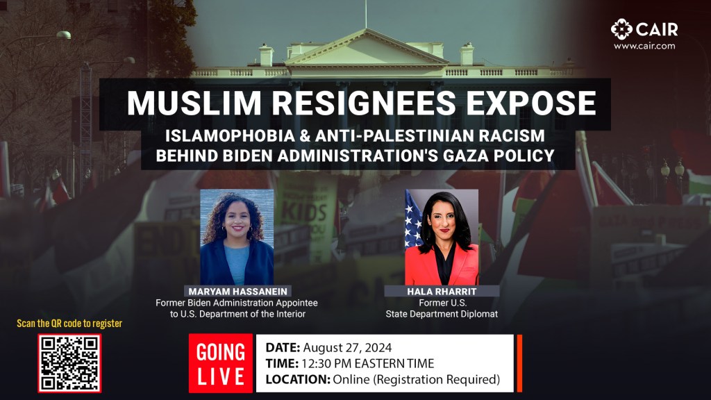 | REMINDER: Muslim Resignees to Speak on the Islamophobia & Anti-Palestinian Racism Behind Biden Administration’s Gaza Policy On Tuesday, Aug. 27 (12:30 p.m. ET), the Council on American-Islamic Relations (CAIR) plans to host a live virtual event featuring interviews with American Muslim former government officials who resigned from the Biden administration in response to its policies on Gaza. |