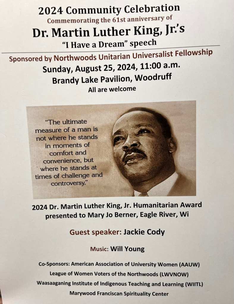 Categories Uncategorized Woodruff, Wisconsin: August 25, 2024 Dr. Martin Luther King Jr. Community Celebration Post author By wibailoutpeople Post date August 25, 2024 Marywood Franciscan Spirituality Center Share this: Share on X (Opens in new window) X Share on Facebook (Opens in new window) Facebook Like Loading... Related ← From Fight the Power To Work for It: Chuck D, Public Enemy and How the CIA Neutralized Rap → PAL-Awda NY/NJ Protests Stolen Land Real Estate Sales