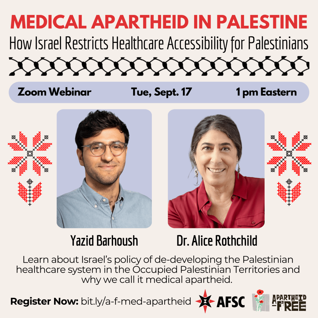 Health care is a human right. But under the Israeli occupation, Palestinians have been deprived of access to even basic medicine, services, and treatment. Israel’s ongoing attacks on Gaza and the West Bank have deepened the crisis. To learn more about medical apartheid in Palestine, register for this American Friends Service Committee (AFSC) Apartheid-Free webinar featuring public health experts and activists Dr. Alice Rothchild and Yazid Barhoush.