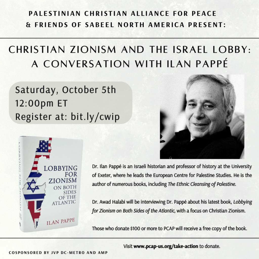 Join Palestinian Christian Alliance for Peace (PCAP) and Friends of Sabeel North America (FOSNA) for “Christian Zionism and the Israel Lobby: A Conversation with Ilan Pappe,” on Saturday, October 5th at 12:00pm ET.