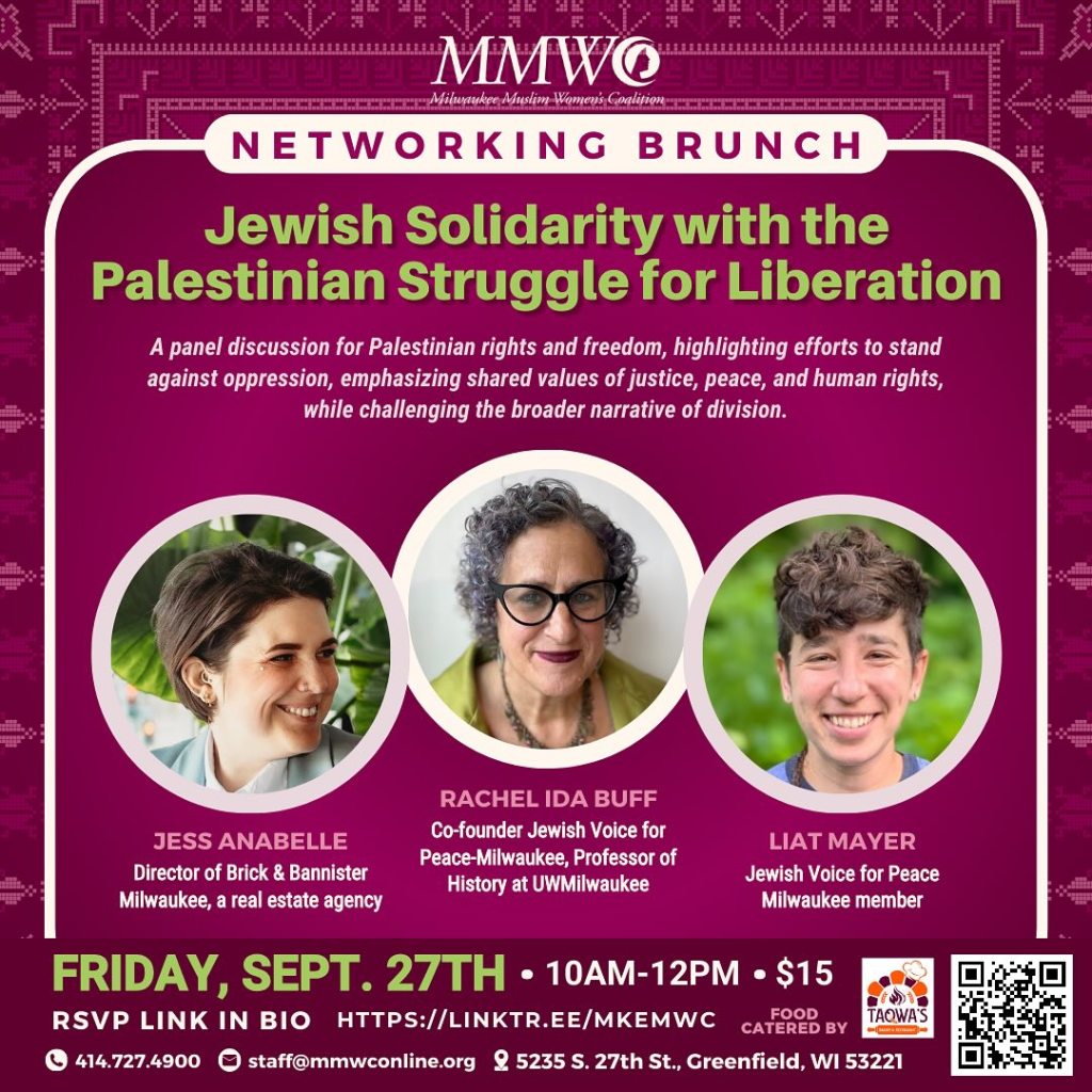 Categories Uncategorized Greenfield, WI, September 27, 2024: Jewish Solidarity with the Palestinian Struggle for Liberation Post author By wibailoutpeople Post date September 16, 2024 Networking Brunch on Jewish Solidarity with the Palestinian Struggle for Liberation with guest speakers from Jewish Voice for Peace—Rachel Ida Buff, Jess Anabelle, and Liat Mayer—on September 27th!Seats are limited, RSVP now! Registration here:https://forms.gle/17uVvwwyMdWehEg2A— at Milwaukee Muslim Women’s Coalition Share this: Click to share on X (Opens in new window) X Click to share on Facebook (Opens in new window) Facebook Like Loading... Related ← Black Alliance for Peace Condemns US Convictions of Uhuru 3 as a Fascist Farce → Press Release: “The Irony of Becoming What you Once Hated” Mural Milwaukee Jewish Voice for Peace