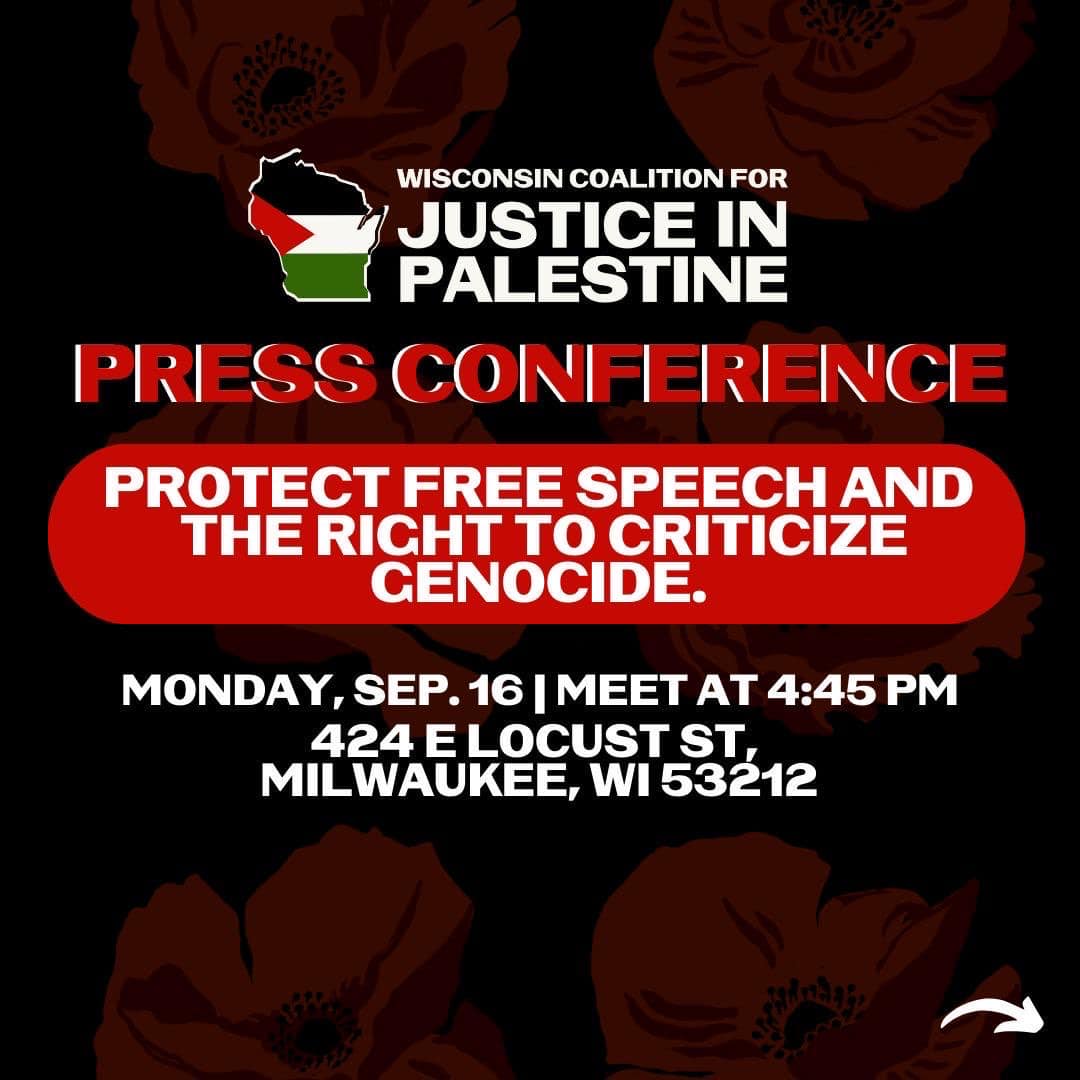 Categories Uncategorized Milwaukee, September 16, 2024: Protect Free Speech and the Right to Criticize! Post author By wibailoutpeople Post date September 16, 2024 Wisconsin Coalition for Justice in Palestine Share this: Share on X (Opens in new window) X Share on Facebook (Opens in new window) Facebook Like Loading... Related ← The Black Alliance for Peace Condemns U.S. Convictions of Uhuru 3 as a Fascist Farce → Milwaukee, September 20-29, 2024: ‘My Name Is Rachel Corrie’ Theatre Production