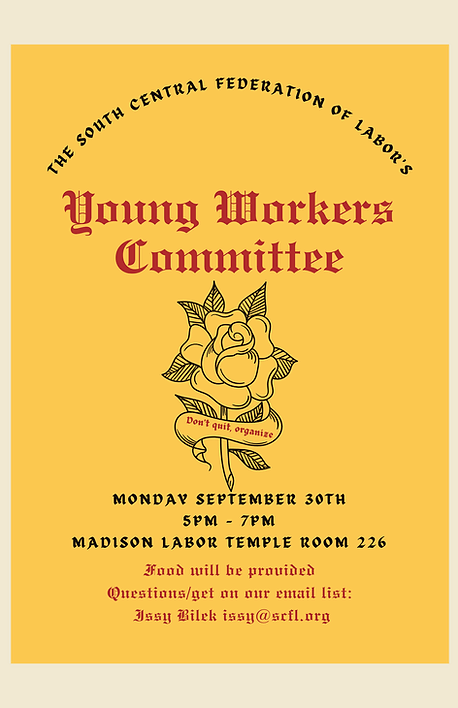 Categories Uncategorized Madison, September 30, 2024: Young Workers Committee Meeting Post author By wibailoutpeople Post date September 18, 2024 South Central Federation of Labor https://www.scfl.org/ Share this: Click to share on X (Opens in new window) X Click to share on Facebook (Opens in new window) Facebook Like Loading... Related ← Madison, September 19, 2024: FIGHT TO SAVE SOCIAL SECURITY AND MEDICARE! Community Meeting → Donate to Worker Justice Wisconsin Solidarity Fund!