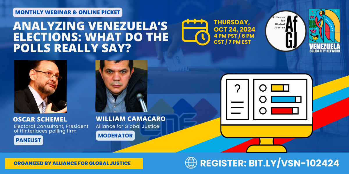 | Join AFGJ for Venezuela Solidarity Network’s next Monthly Webinar/Online Picket Thursday, October 24 at 4 pm PT / 6 pm CT / 7 pm ET Join us for a conversation with Oscar Schemel, Electoral Consultant and President of one of Venezuela’s most credible polling firms, Hinterlaces. We’ll discuss the electoral outcome and the broader context of public opinion within Venezuelan society, including socioeconomic, political and cultural elements that motivated the vote; trends in political participation; and popular communal organization. |