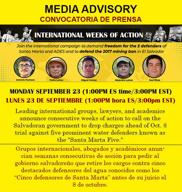 | CONVOCATORIA DE PRENSA El esperado juicio de defensores ambientales en El Salvador comienza el 8 de octubreGrupos internacionales, abogados y académicos anuncian semanas consecutivas de acción para pedir al gobierno salvadoreño que retire los cargos contra cinco destacados defensores del agua conocidos como los “Cinco defensores de Santa Marta” antes de su juicio el 8 de octubre. Las acciones confirmadas en Estados Unidos, Canadá, España, el Reino Unido, México, Francia, Chile y Alemania, entre otros países, llamarán la atención a la demanda de retirar los cargos debidos a las motivaciones políticas contra cinco destacados líderes comunitarios, miembros del movimiento anti minero.Obtenga más detalles sobre las semanas de acción participando en una conferencia de prensa virtual internacional el 23 de septiembre a la 1:00PM hora de El Salvador / 3:00PM EST para el lanzamiento oficial de las semanas de accion. El evento está abierto a la prensa y al público. POR FAVOR REGISTRARSE AQUI |