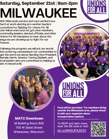Categories Uncategorized Milwaukee, September 21, 2024: Unions For All! Rally Post author By wibailoutpeople Post date September 19, 2024 SEIU Wisconsin Share this: Click to share on X (Opens in new window) X Click to share on Facebook (Opens in new window) Facebook Like Loading... Related ← Anti-Fascist Organizing Committee Launched → Missouri: Call Gov. Parson to Stop the Sept. 24 Execution of Marcellus Williams: 417-373-3400