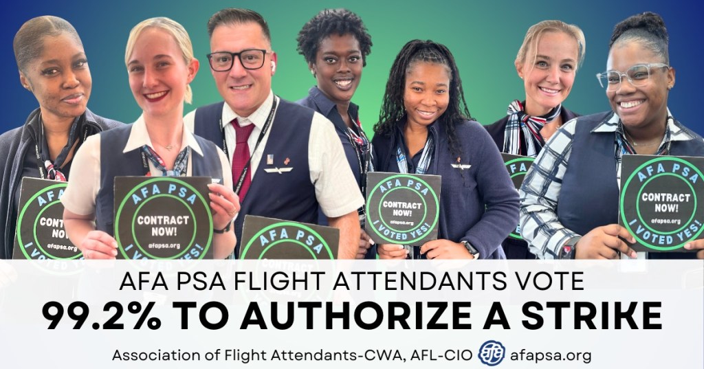 BREAKING: AFA PSA Flight Attendants voted 99.2% to authorize a strike. The results come after months of insulting proposals from PSA management during contract negotiations.