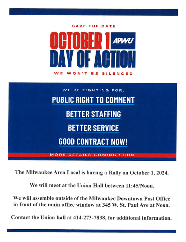Categories Uncategorized Milwaukee, October 1, 2024: Stand in Solidarity with APWU! Hands Off the U.S. Postal Service! No Privatization! Union, Yes! Post author By wibailoutpeople Post date September 20, 2024 Share this: Click to share on X (Opens in new window) X Click to share on Facebook (Opens in new window) Facebook Like Loading... Related ← October 5, 2024: Worldwide Actions – One Year of U.S.-‘Israel’ Genocide; One Year of People’s Resistance! → Wisconsin: Stand for Peace! Free Palestine! Events September 23-28, 2024 (City Listings)