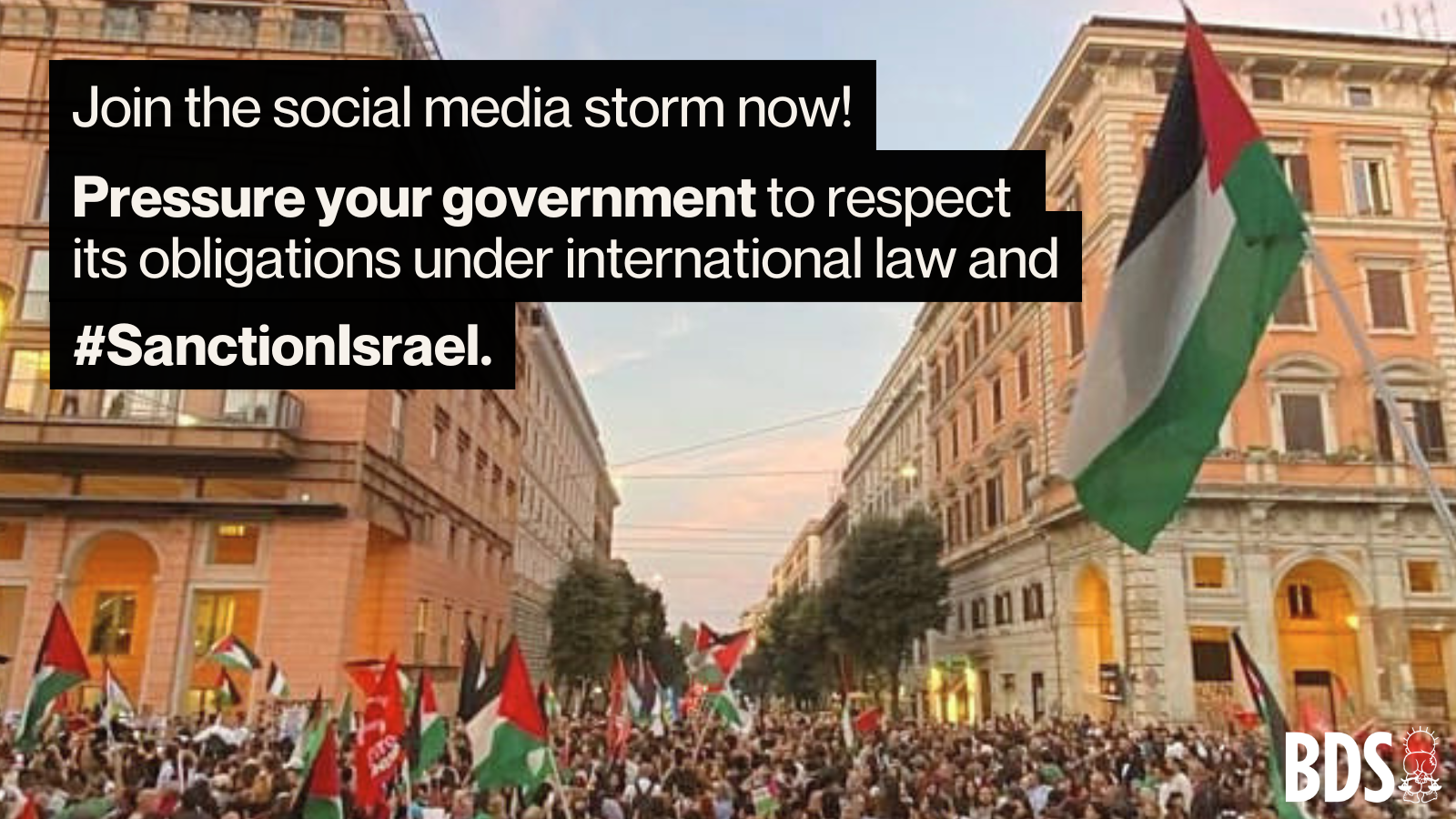 | Now is the time to pressure your government to respect its obligations under international law, pay heed to the unified Palestinian civil society call and #SanctionIsrael. As Israel’s livestreamed genocide in the illegally occupied Gaza Strip against 2.3 million Palestinians reaches its first anniversary, as its aggression and ethnic cleansing in the occupied West Bank, including East Jerusalem, intensify, and as it pushes the region in a catastrophic direction, join us in pressuring governments, especially those in the Global South, to isolate genocidal Israel and impose meaningful sanctions on it to hold it accountable for its crimes. Failing to do so would plunge us all into a world where “might makes right.” |