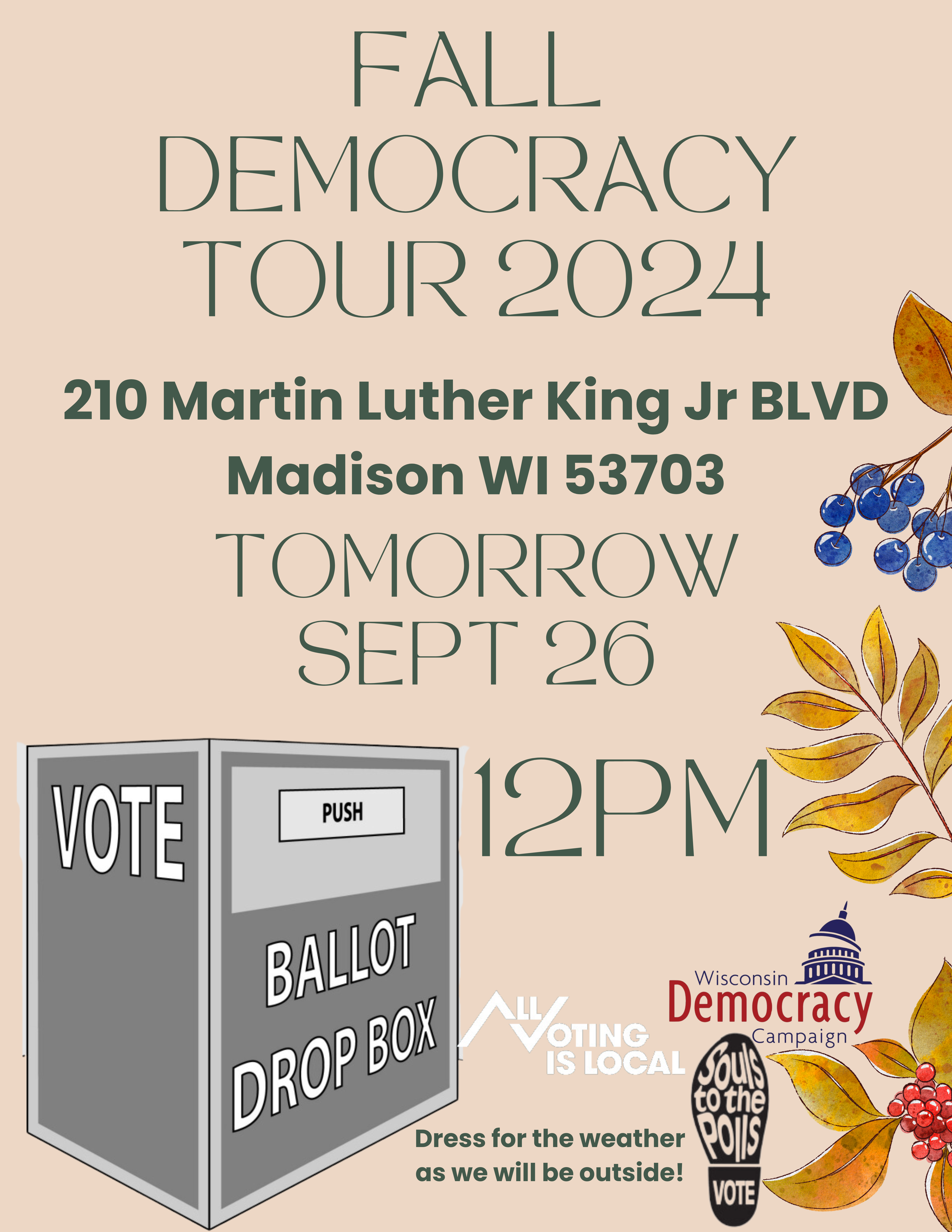 MADISON, WI – Following news out of Wausau of Mayor Doug Diny’s unwarranted removal of the only drop box in the city, voters in Wisconsin will join together in calling for an investigation into his actions and call attention to attempts to suppress voters across the state. These voter suppression tactics to limit drop boxes are rooted in the Big Lie and are in opposition to Wisconsin values. For years, voters across Wisconsin safely and securely cast their ballots via drop boxes across the state. No matter where we work or what part of the state we call home, working Wisconsinites should be able to vote easily and safely. Making it harder to vote is out of touch with Wisconsin values.