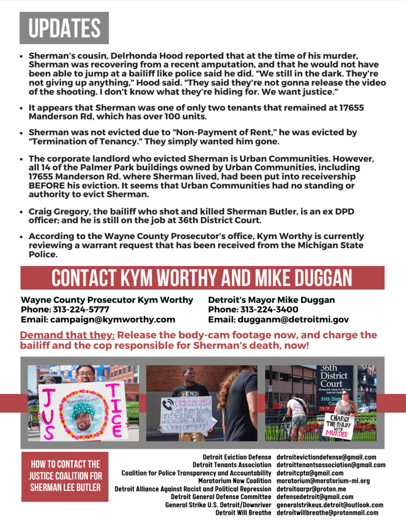 Categories Uncategorized Detroit: Justice for Sherman L Butler! Post author By wibailoutpeople Post date September 27, 2024 Share this: Click to share on X (Opens in new window) X Click to share on Facebook (Opens in new window) Facebook Like Loading... Related ← COLUMBIA AND BARNARD: STOP STAFF, STUDENT AND FACULTY REPRESSION! – Sign On Letter → Israel Continues its Indiscriminate Carpet Bombing of Lebanon