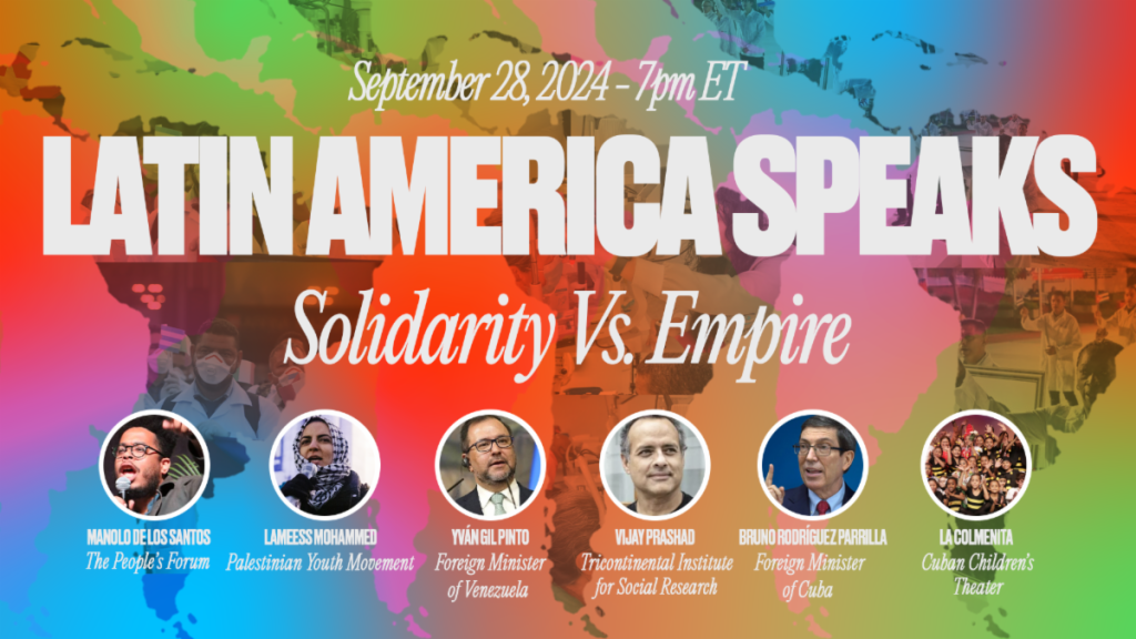 | We join our friends at The People’s Forum with a special invitation to a live-streamed evening of hope, solidarity, and building the future! Latin America Speaks: Solidarity Vs. Empire will include powerful dialogue from those leading the world towards peace and a better future. The livestream will begin at 7:00PM tonight, Saturday, September 28th, 2024. We will hear from the Foreign Minister of Cuba, Bruno Rodríguez Parilla, the Foreign Minister of Venezuela, Yván Gil Pinto, Executive Director of the Tricontinental Institute for Social Research, Vijay Prashad, Organizer with the Palestinian Youth Movement, Lameess Mohammed, and Executive Director of the People’s Forum, Manolo De Los Santos. The Program will include a special performance by the world-renowned Cuban children’s theater company & UNICEF Goodwill Ambassador, La Colmenita. In these challenging times of social, economic and climate crisis, US imperialism continues on a warpath across the planet, organizing coups, invasions and imposing sanctions. Yet, Latin America offers a beacon of hope through solidarity. Countries like Cuba and Venezuela demonstrate alternative development models based on cooperation and mutual aid, from sending doctors worldwide to offering scholarships to the poor of the global south. This event celebrates the ties between people’s movements and organizations in the United States and Latin America, fostering a shared vision for the future based on solidarity. Don’t miss this unique opportunity to engage with leaders advocating for anti-imperialism and people’s democracy. The event will be streamed live via BreakthroughNews on Youtube here. Share on Instagram! Share on X Cuba & Venezuela lead the world globally in their solidarity with the struggle of the Palestinian people. Following in their path, this event is also a fundraiser for the Middle East Children’s Alliance. Donate to the international fundraiser here. The IFCO/Pastors for Peace Family |