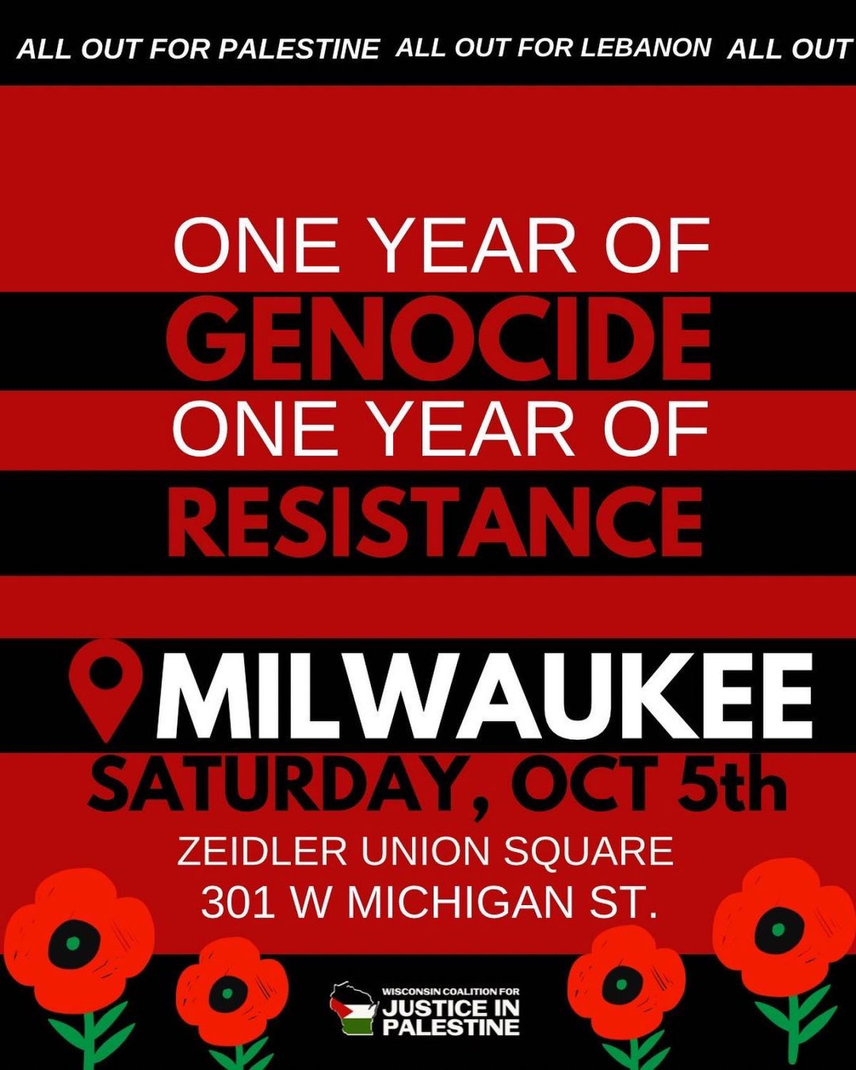 Join the Wisconsin Coalition for Justice in Palestine for a rally recognizing one year of genocide and one year of resistance in Palestine. The event will occur on Saturday, Oct 5th at Zeidler Union Square, 301 W. Michigan St. in Milwaukee, WI.