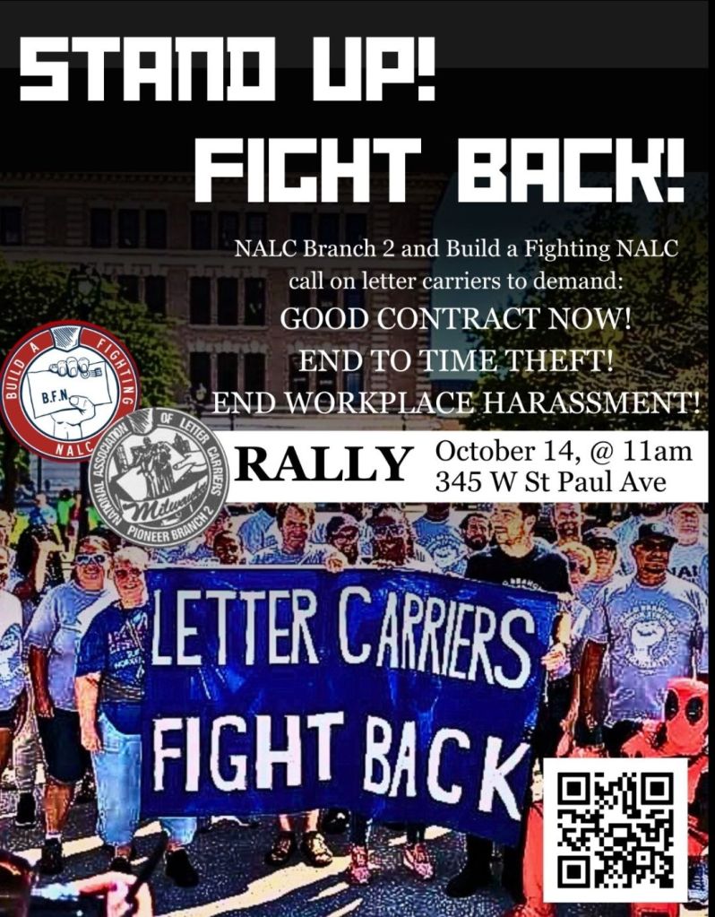 Categories Uncategorized Milwaukee, October 14, 2024 – Support Letter Carriers Rally! Post author By wibailoutpeople Post date October 3, 2024 345 St Paul Avenue at 11 A.M. NALC Pioneer Branch 2 Share this: Share on X (Opens in new window) X Share on Facebook (Opens in new window) Facebook Like Loading... Related ← ‘Crushing Response’ – Iran Strikes Dozens of Targets throughout Israel with Hundreds of Ballistic Missiles – Palestine Chronicle → Salute to Kris Kristofferson!