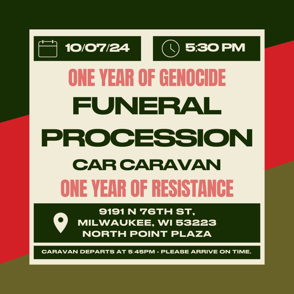 Tues Oct 8, 7 pm — Vigil for Palestine: “Killing the Flowers Will Never Delay Spring.” At the Islamic Community Center (815 W Layton Ave). Remember all the beautiful lives the world has lost at the hands of the apartheid state. One year of genocide. One year of resistance. Remember the martyrs. Remember the 40,000+ men, women, and children killed. Remember the children, the health care workers, the journalists. Remember the thousands of unrecognizable bodies. Remember the tens of thousands of innocent people lost under the rubble.