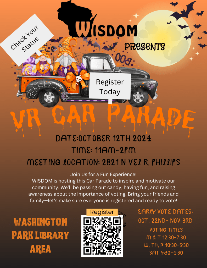 WISDOM Voter Registration Car Parade happening on October 12th, 2024, from 11 AM to 2 PM starting at 2821 N Vel R. Phillips and leading into the Washington Park Library Area.