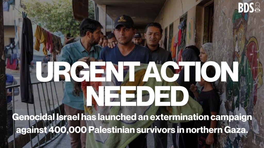 | Dear supporter, In the midst of its genocide against 2.3 million Palestinians in the occupied Gaza Strip, Israel is intensifying its massacres in northern Gaza to forcibly displace the surviving Palestinian population–some 400,000 people. For seven days, Israeli forces have blocked the only three entrances and imposed a siege that has included heavy airstrikes and shelling, particularly targeting what is left of the Jabalia refugee camp. As the death toll rises, the bodies of many massacred Palestinians lie in the streets, inaccessible due to the ongoing blockade. Israeli forces are firing on Palestinians attempting to rescue the injured. Israel has ordered hospitals in the north of Gaza to evacuate all staff and patients, threatening bombardment if they fail to comply. In parallel, it is escalating its bloody aggression in the occupied West Bank, its rolling massacres in Lebanon, even bombing a UN peacekeepers’ position, and its bombing campaigns in Syria, Iraq and Yemen. Israel’s unprecedented criminality is a direct result of its unprecedented impunity, made possible through the arming, funding and full partnership of the colonial West, led by the US. Only our people power can build the pressure needed to stop Israel’s carnage and help dismantle its 76-year-old regime of settler-colonialism and apartheid. |