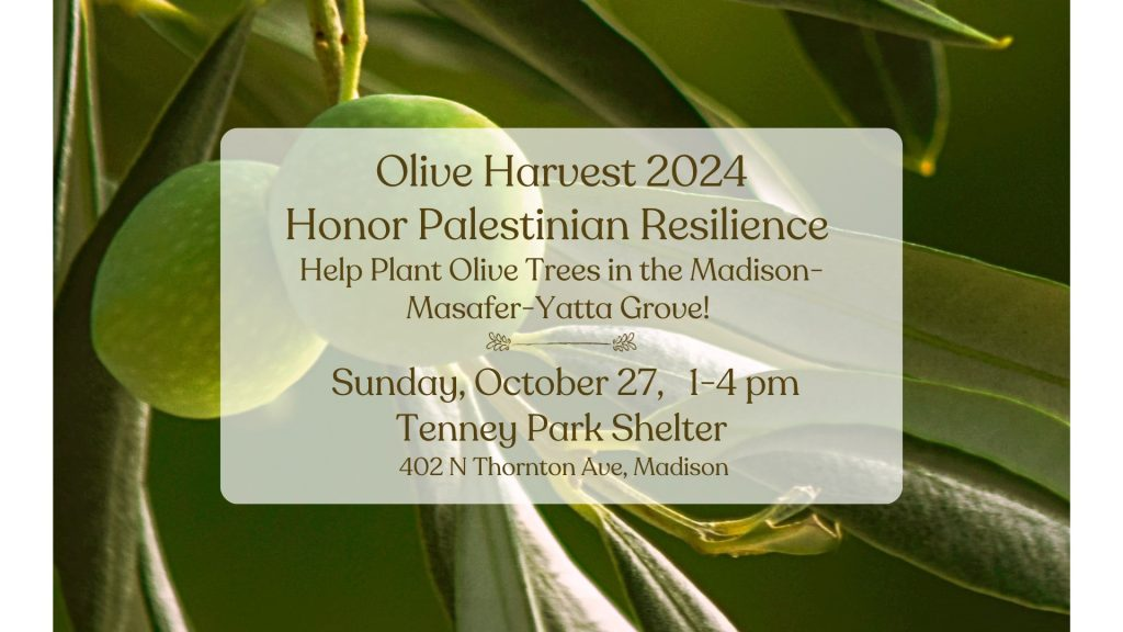 Hear from Madison groups working to end the Genocide in Gaza, and learn about the Madison-Masafer Yatta Olive Grove, a project to help farmers remain on their lands in the southern West Bank despite a spiking campaign of settler and military violence that includes the destruction of olive groves.