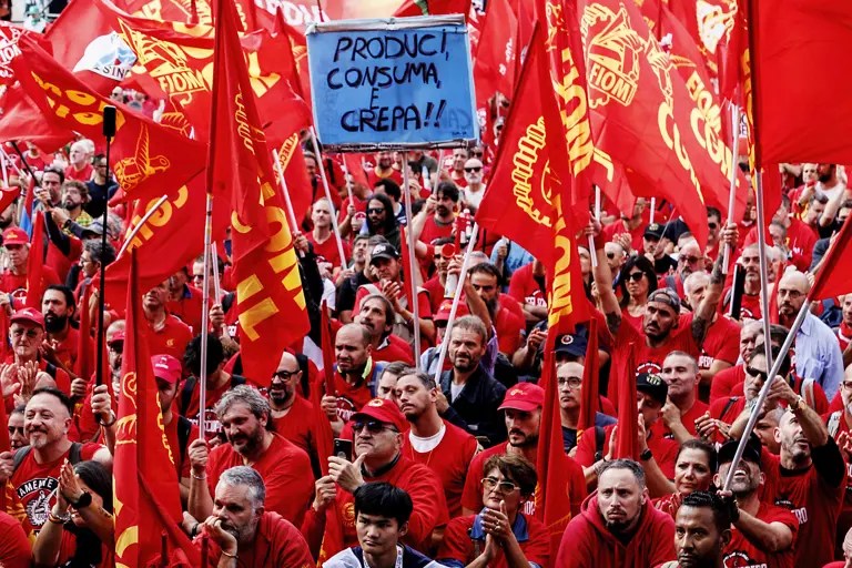 Demonstrators wave union flags on the occasion of a national strike of metalworkers of the automotive sector for the first time in 20 years, in Rome, Friday, Oct. 18 2024. Writing on sign at center reads in Italian “Produce, Consume and Die!”. (Roberto Monaldo/LaPresse via AP)