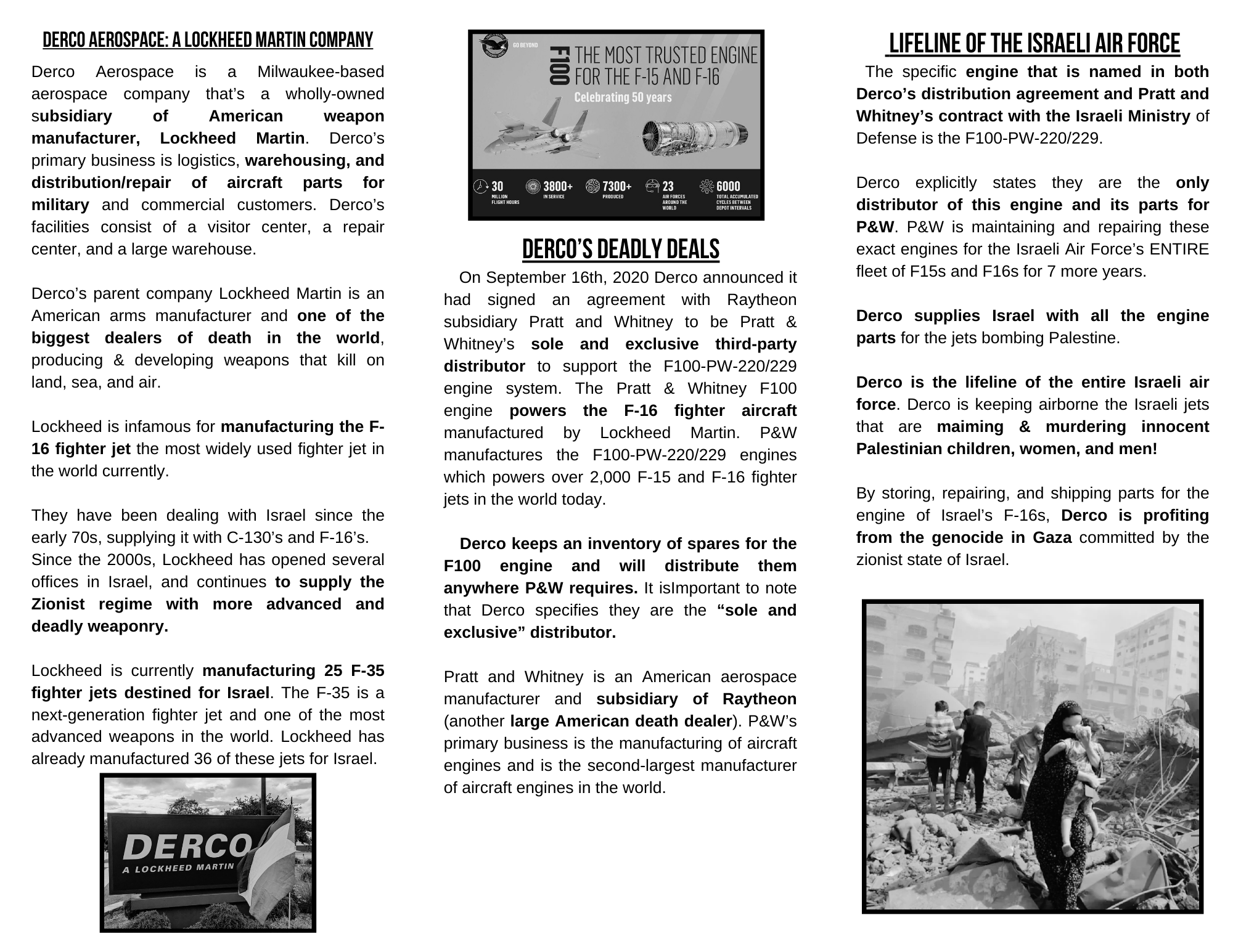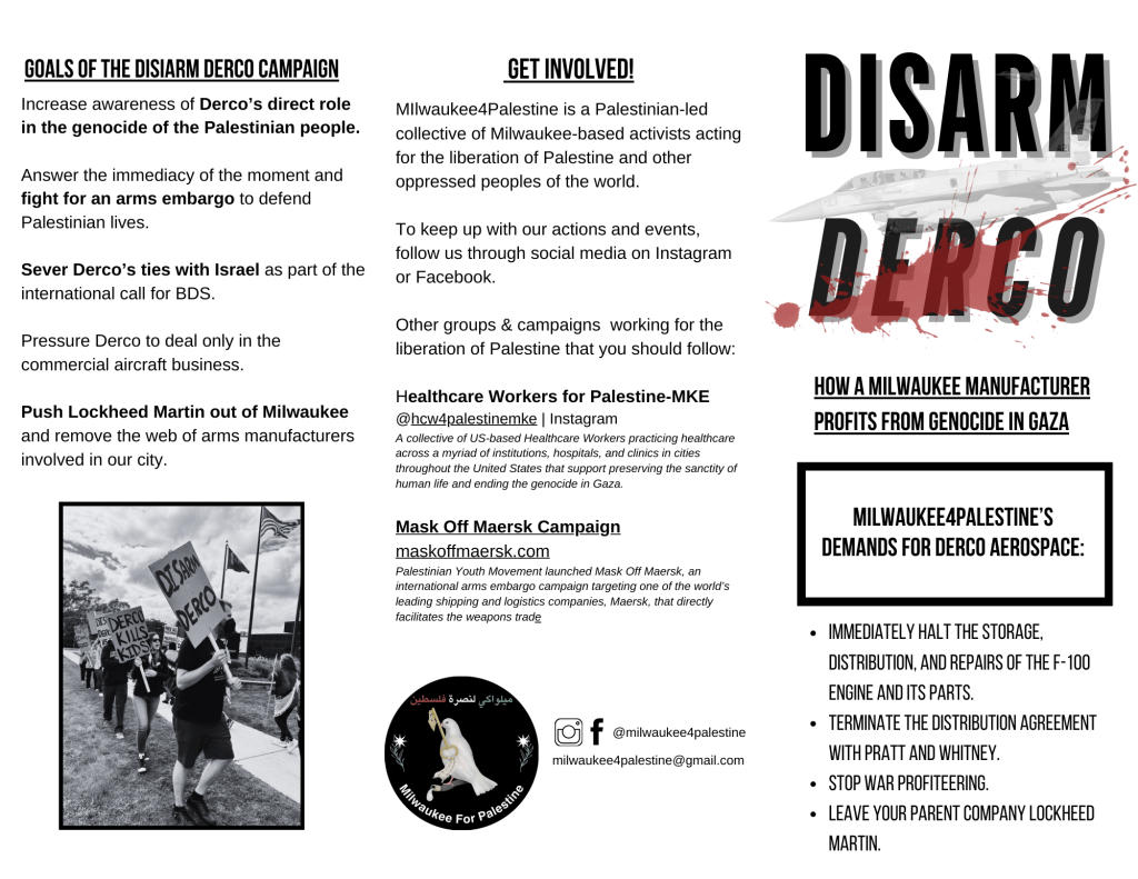 Categories Uncategorized Milwaukee: Disarm Derco! Help Stop A Manufacturer from Making Profits Off Genocide in Palestine! Post author By wibailoutpeople Post date October 19, 2024 @milwaukee4palestine milwaukee4palestine@gmail.com Milwaukee4Palestine https://www.maskoffmaersk.com/ Share this: Share on X (Opens in new window) X Share on Facebook (Opens in new window) Facebook Like Loading... Related ← Labor Radio at WORT → Detroit: Moratorium Now Coalition Returns to In-Person Weekly Meetings
