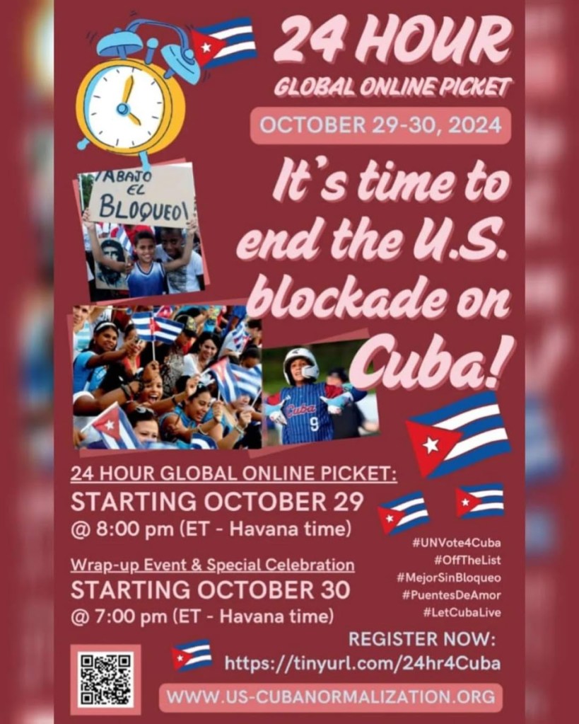 | A 24-hour Global Online Picket to End the U.S. Blockade on Cuba! + Remove Cuba from the so-called “State Sponsors of Terrorism” list! begins Oct. 29 at 8 p.m. Cuba time and ends Oct. 30 at 7 p.m. Join: tinyurl.com/24hr4Cuba or scan the QR code for more information. In October 2024 Cuba will bring a resolution to the United Nations to end the cruel U.S. Blockade on Cuba for the 32nd consecutive vote! While the government of the U.S. votes “no” to ending the inhuman and illegal blockade, the people of the United States & the world vote “YES”! International actions will take place around the world October 26-30 marking the annual United Nations General Assembly vote. Join us for the 24-hour global online picket with a program of speakers, documentaries, music, and more as we stand by Cuba and its just demand for an end to this cruel U.S. policy. – 24 HOUR GLOBAL ONLINE PICKET: Starting Tuesday October 29, 2024 8:00 pm (ET – Havana time) – Special Celebration & Wrap-up: Starting Wednesday October 30, 2024 7:00 pm (ET – Havana time) – Send video messages for the 24-hour Global Online Picket action: Whatsapp: +1-778-882-5223 Email: info@us-cubanormalization.org Organized by the U.S.-Cuba Normalization Conference Coalition https://www.us-cubanormalization.org #UNVote4Cuba #OffTheList |