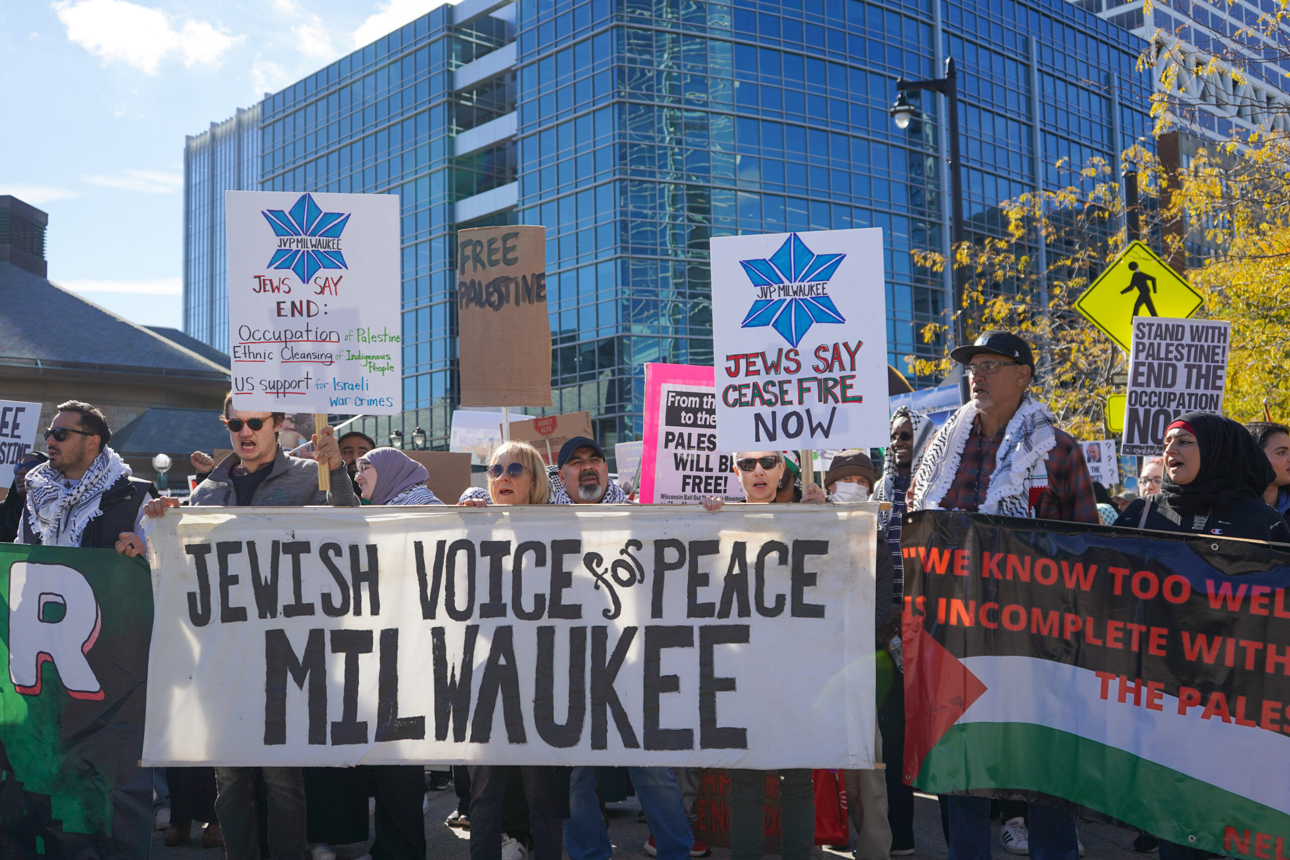 We protest the exclusion of the Jewish Voice for Peace in the narrative of how Jewish groups in Milwaukee view the war in Palestine. They don’t share the view that Israel has the right to use any means necessary to defend itself, they say stop the genocide and “Not in Our Name.”