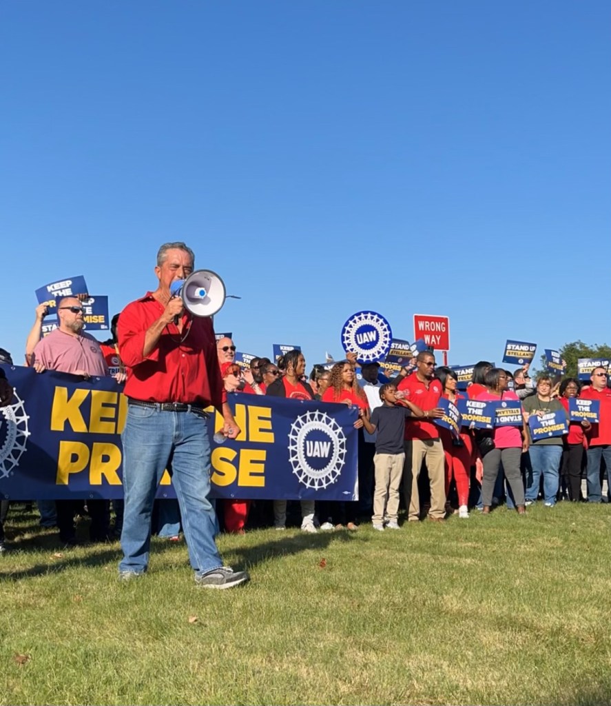 Outside the UAW Local 1264, about 400 UAW members listened to speeches from UAW leadership, including UAW President Shawn Fain, and chanted, “Keep the promise” and “Fire Tavares” (Carlos Tavares is the CEO of Stellantis, the automaker that owns the Jeep, Ram, Chrysler, Dodge and Fiat brands). They then marched about a half mile to Stellantis’ Sterling Stamping Plant.