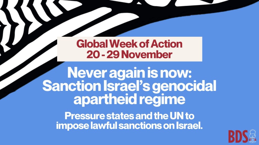 | In September, the UN General Assembly passed a historic resolution, calling for states and the UN to sanction Israel. 124 states across the globe committed to take the first steps to impose lawful sanctions. The time to make this a reality is now! Join us in a global week of action from 20th to 29th November and pressure your government to heed the unified Palestinian call for sanctions by: Calling for or supporting the suspension of Israel at the UNGA and its exclusion from international fora.Imposing a mandatory, comprehensive two-way military embargo on Israel.Imposing targeted diplomatic, trade, banking and financial sanctions and cutting academic, cultural and other cooperation agreements. Refraining from aiding, assisting or recognizing the unlawful situation created by Israel’s breaches of international law, including through a comprehensive ban on business involving Israel’s illegal presence in the occupied Palestinian territory, including East Jerusalem. Imposing targeted sanctions on complicit individuals, as well as on Israeli and international corporations and institutions complicit in Israel’s crimes. |
