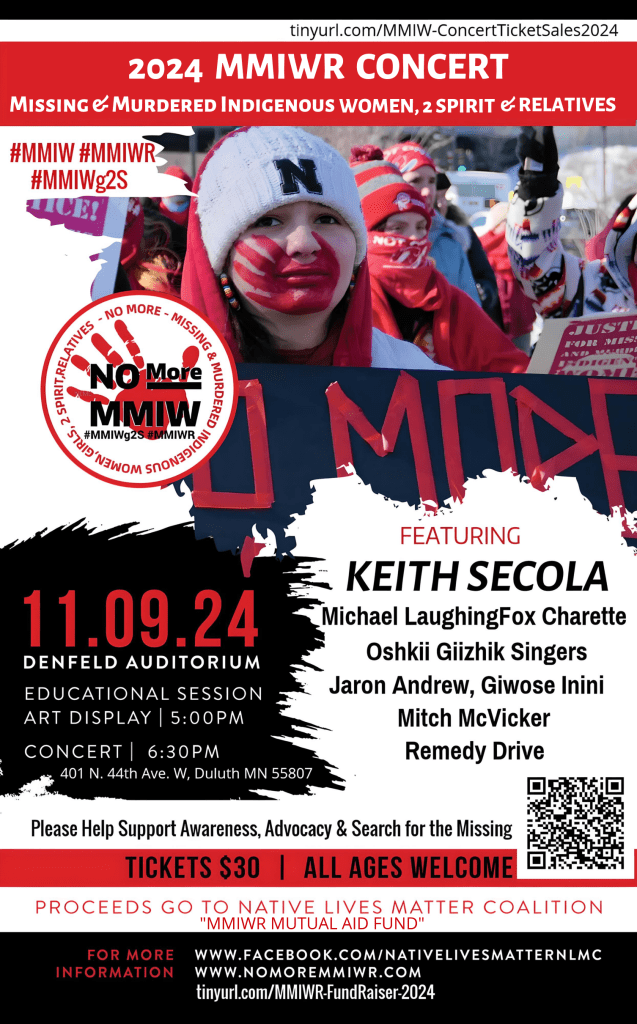2024 Upcoming fundraiser event to be held at Denfeld High School Auditorium on Saturday November 9th featuring a number of amazing artists including Keith Secola Band, Micheal LaughingFox Charette, Oshkii Giizhik Singers, Jaron Andrews, Giwose Inini, Mitch McVicker Music, and Remedy Drive!